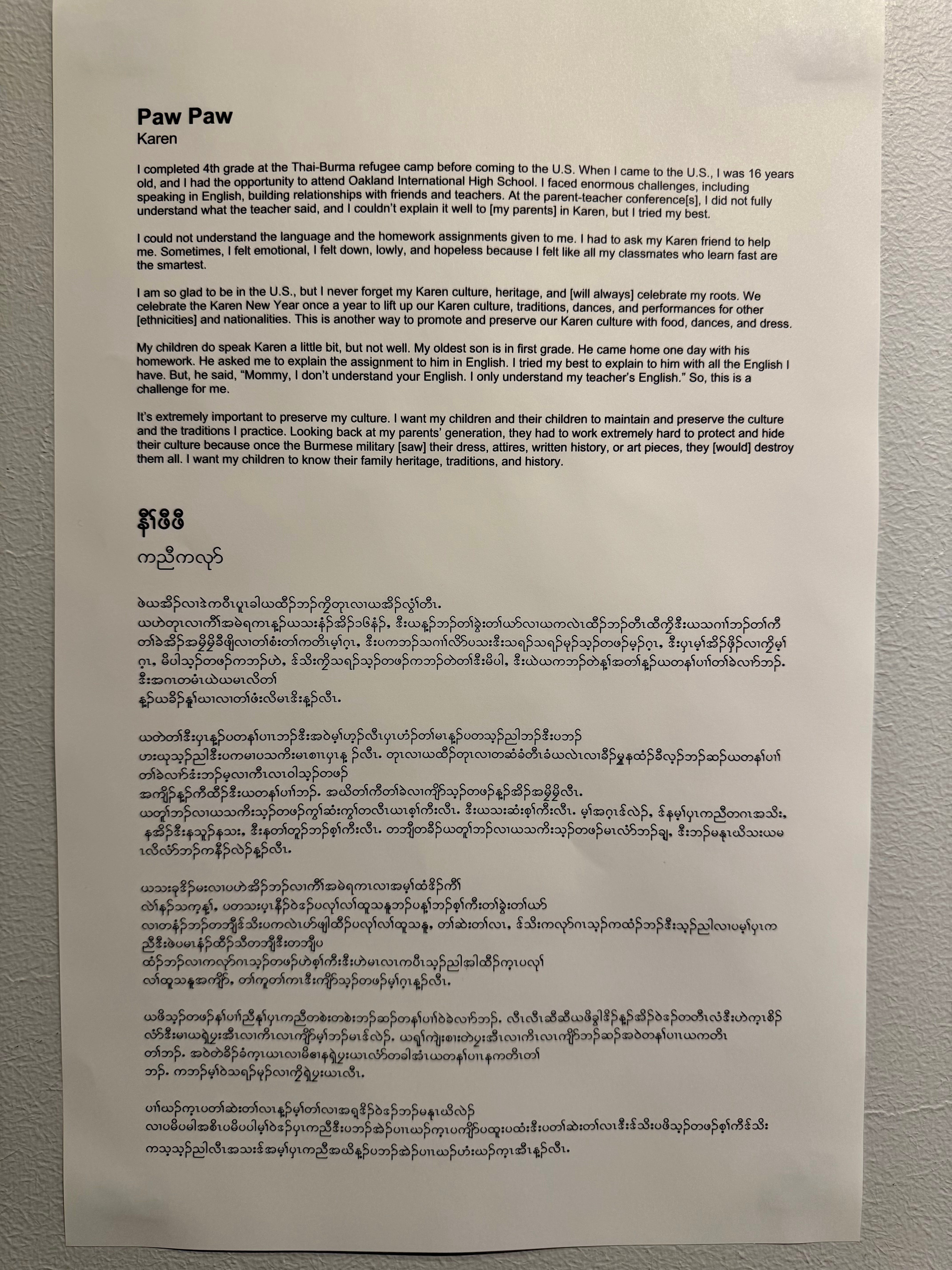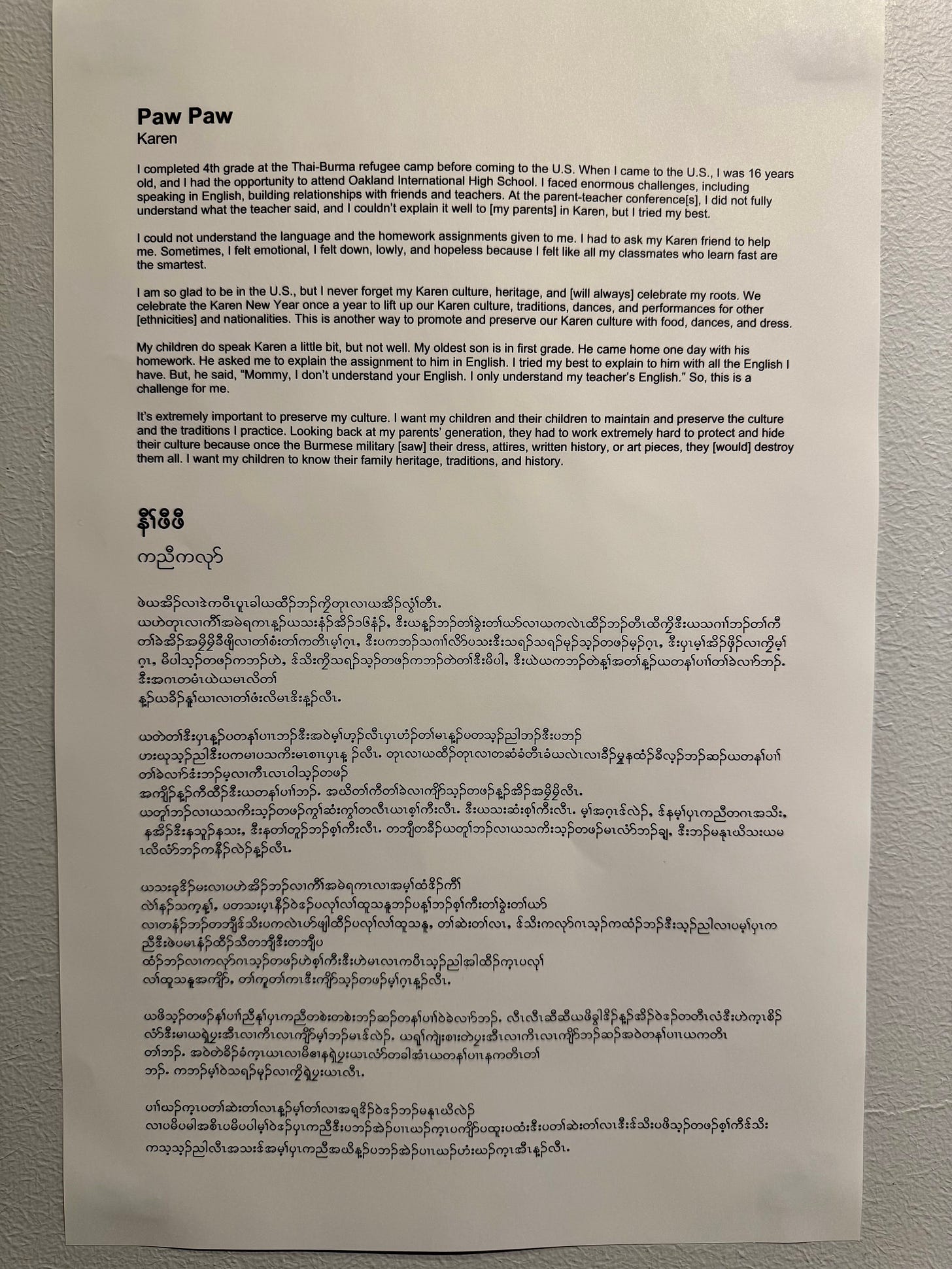 “I completed the 4th grade at the Thai-Burma refugee camp before coming to the U.S. When I came to the U.S., I was 16 years old, and I had the opportunity to attend Oakland International High School. I faced enormous challenges, including speaking in English, building relationships with friends and teachers.”