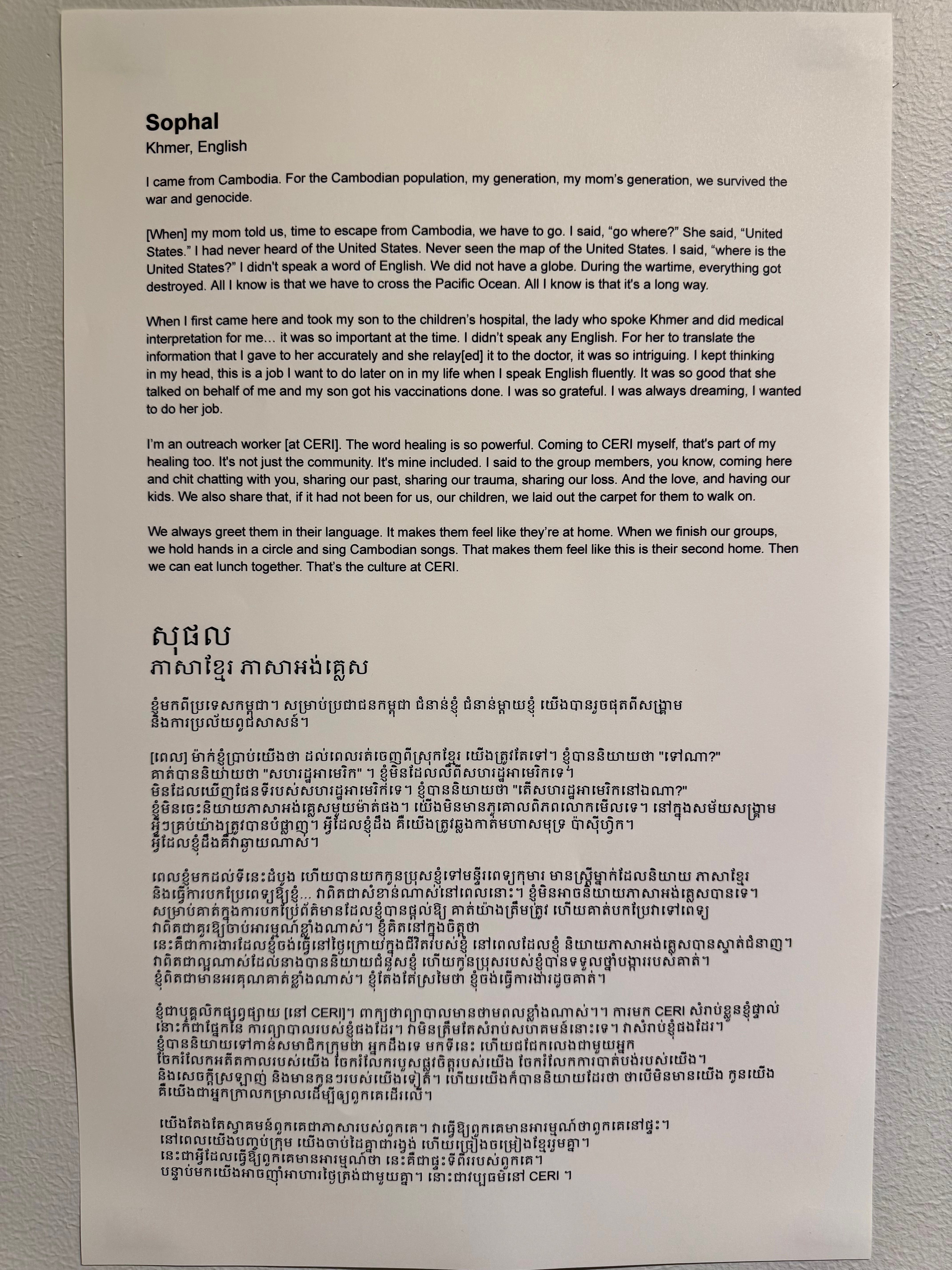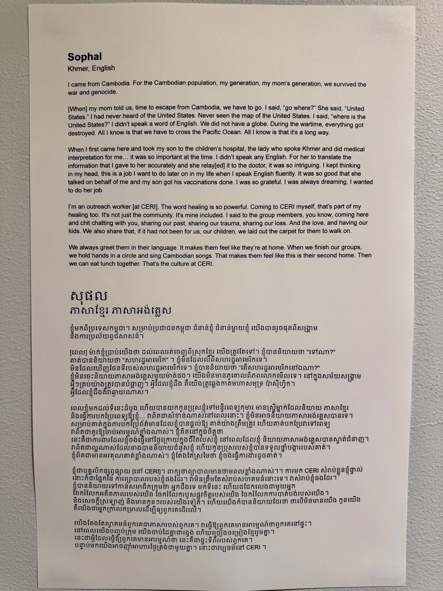 “When I first came here and took my son to the children’s hospital, the lady who spoke Khmer and did medical interpretation for me… it was so important at the time. I didn’t speak any English. For her to translate the information that I gave to her accurately and she relay[ed] it to the doctor, it was so intriguing. I kept thinking in my head, this is a job I want to do later in life when I speak English fluently.”